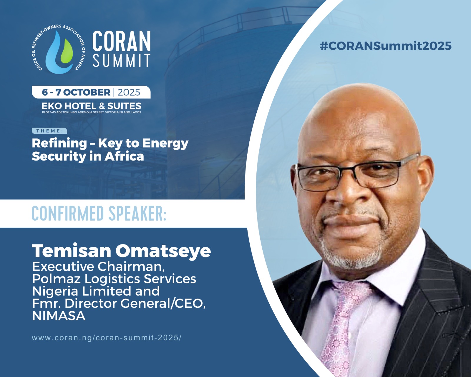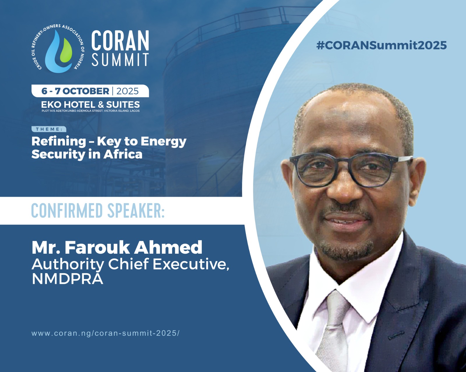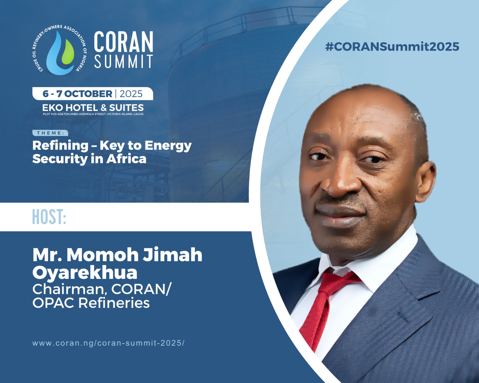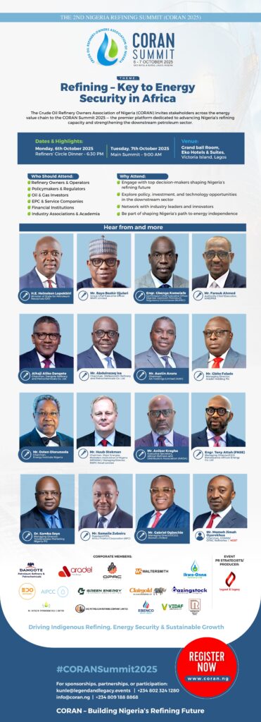 Join us at Eko Hotel and Suites in Lagos for the CORAN Summit 2025, a gathering of Industry Experts, Regulators, Legislators, Professionals, and Stakeholders in the Refining Sector. The summit, themed “Refining – Key to Energy Security in Africa,” will take place on October 6-7, 2025.